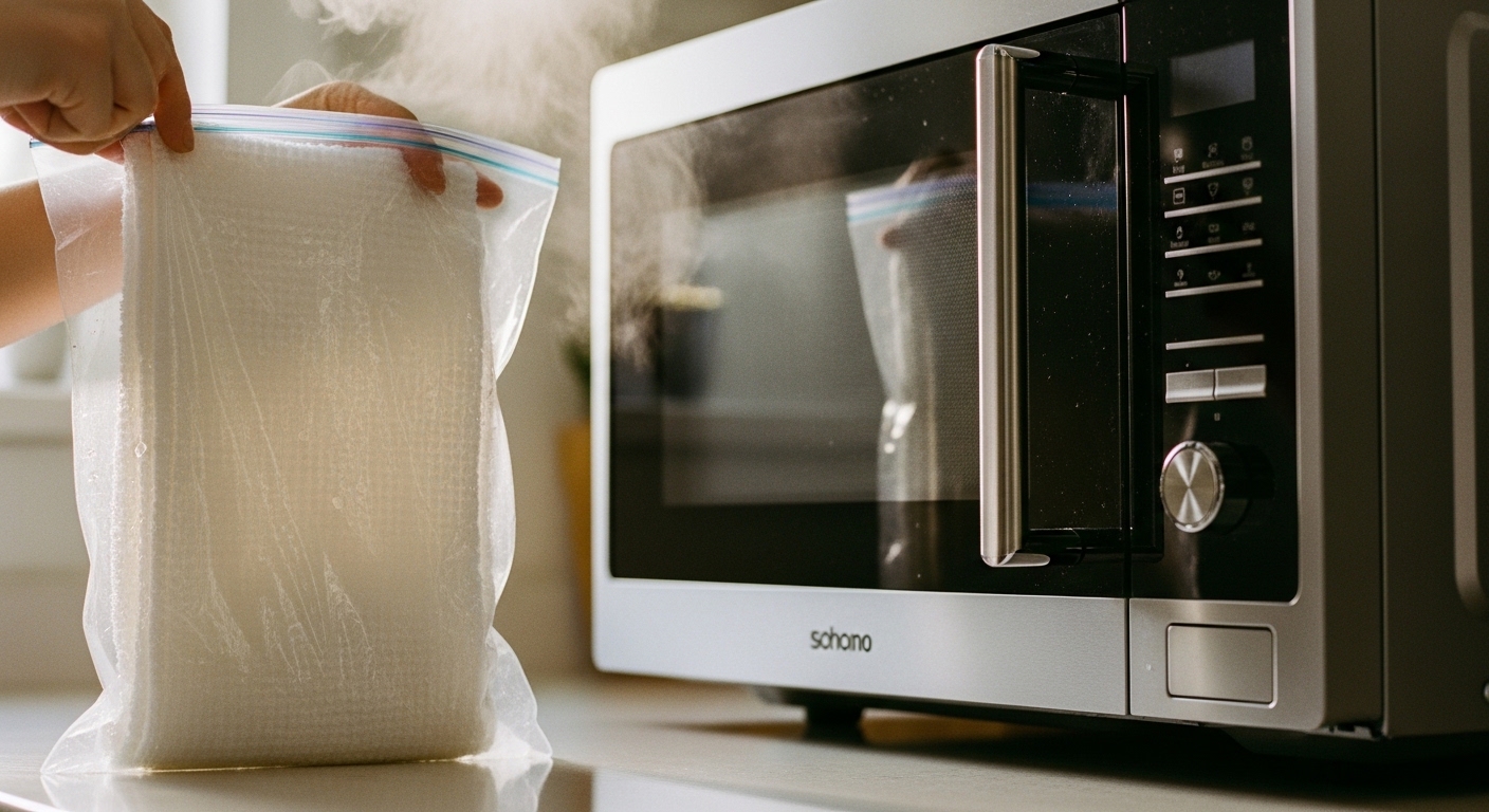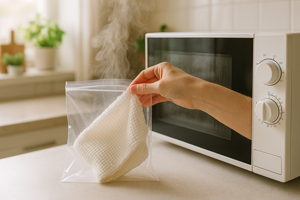 👉 네, 가능합니다! 전자레인지용 깊은 그릇에 행주를 넣고 물을 자작하게 부은 뒤 돌려주세요. 다만, 비닐봉지가 수분을 더 잘 가두어 스팀 효과가 강력합니다.